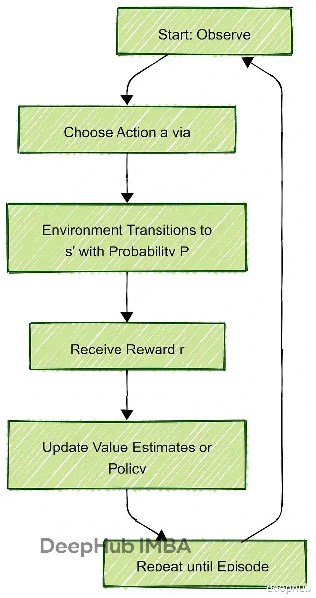 RL的核心是Markov Decision Process(MDP),它把决策过程拆成几个要素:状态(State)、动作(Action)、转移概率(Transition)、奖励(Reward)和折扣因子(Discount Factor)。形式化表示是个五元组 (S, A, P, R, γ)。